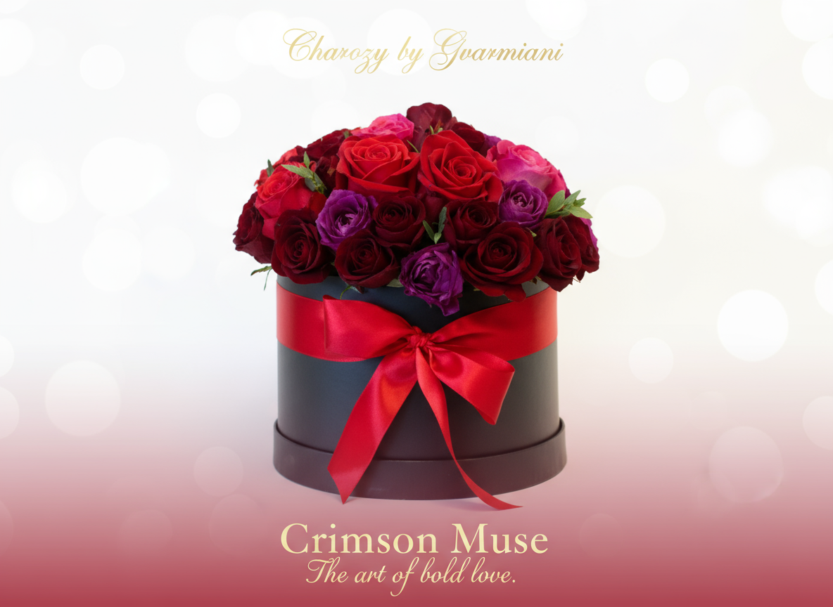 A bold expression of passion and elegance — deep red and purple blooms wrapped in black luxury.