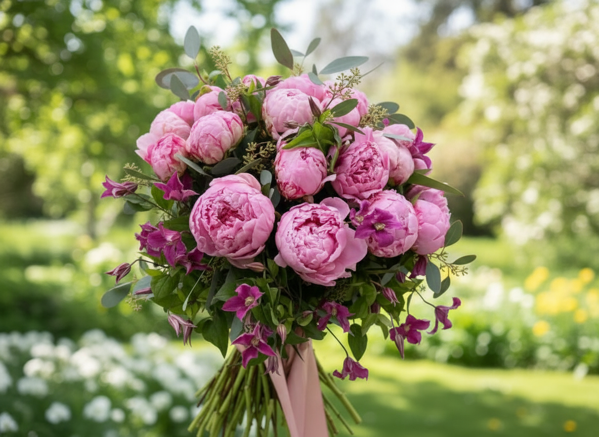 A royal bouquet of lush pink peonies and wild accents — bold, feminine, and unforgettable.