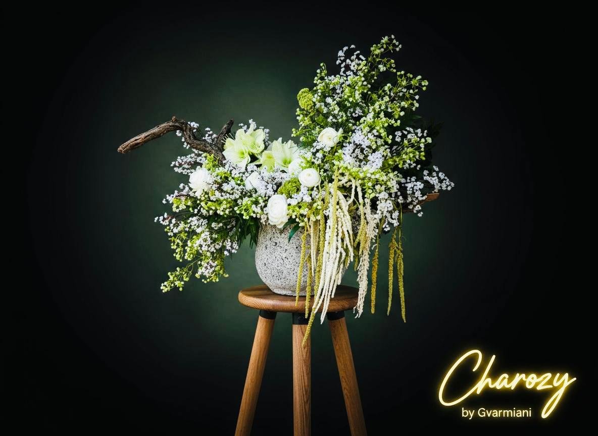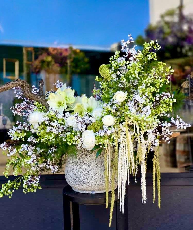 A poetic floral sculpture with white blooms and a dove — symbol of peace and eternal grace.